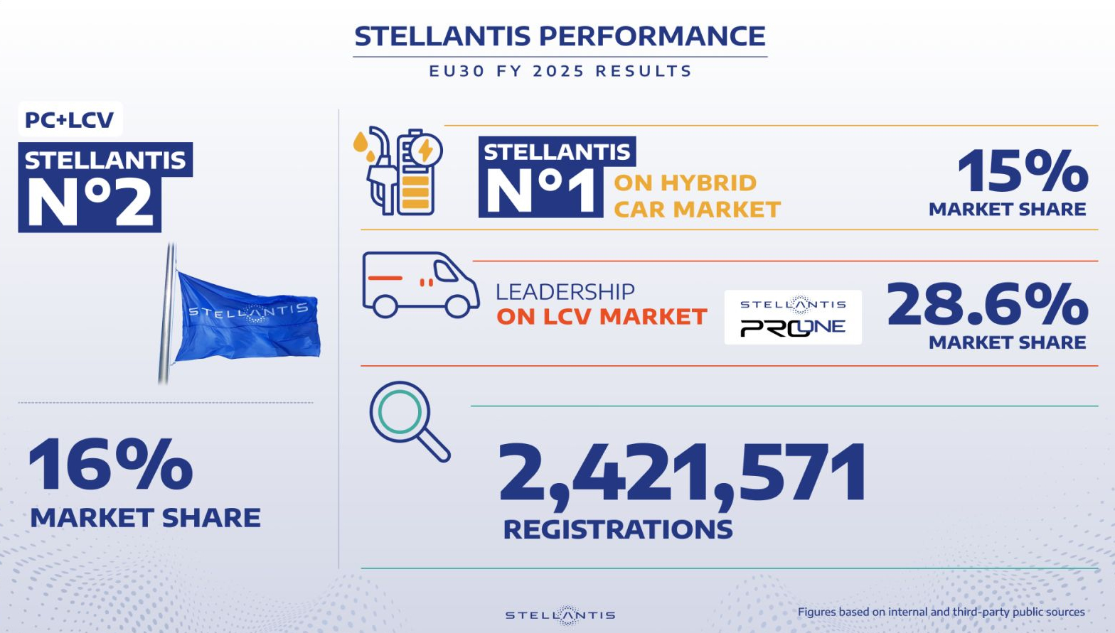 Stellantisin valmistamia henkilöautoja ja kevyitä hyötyajoneuvoja ensirekisteröitiin 2.421.571 kappaletta vuonna 2025, mikä vahvisti sen asemaa toiseksi suurimpana EU30-maiden automarkkinoilla.